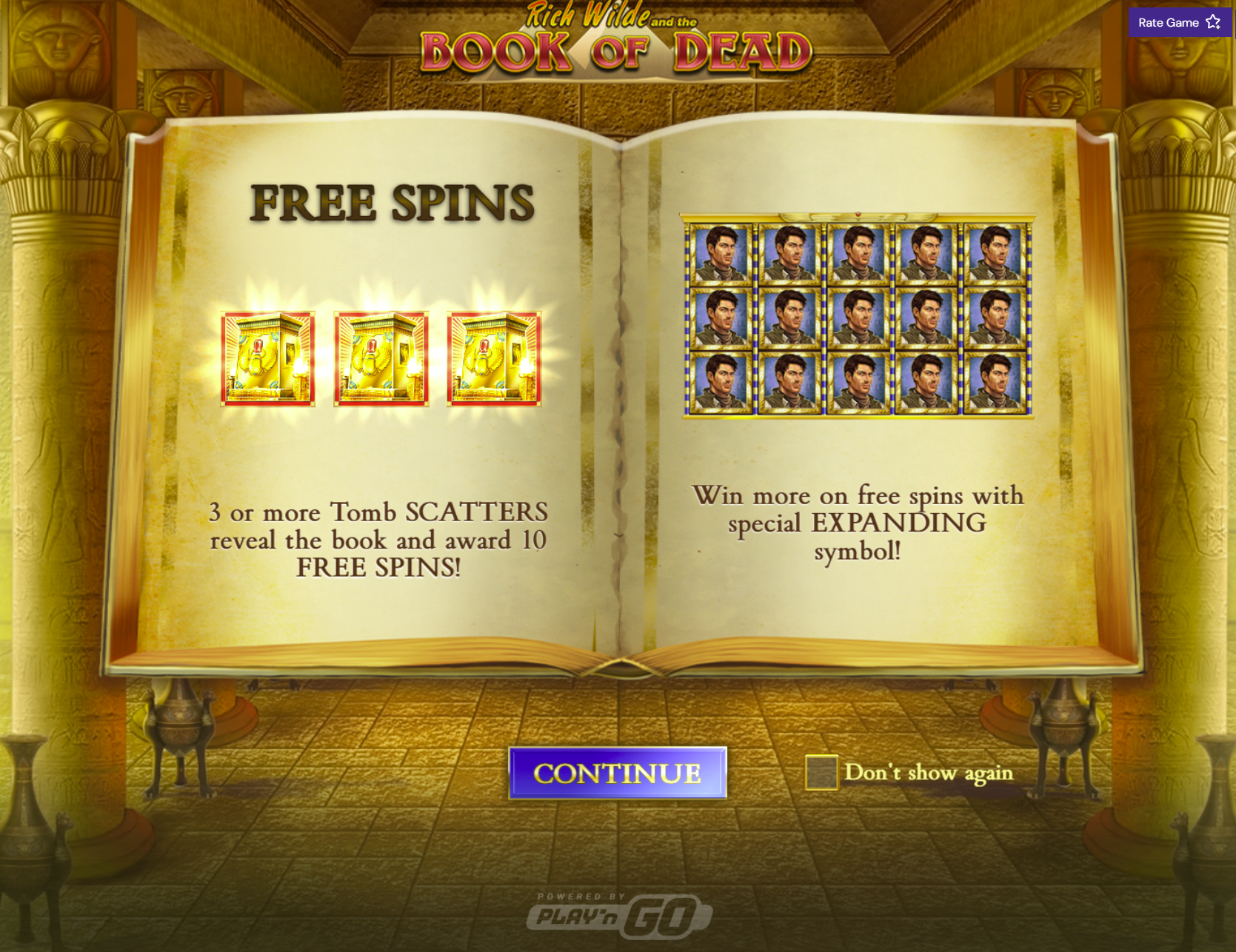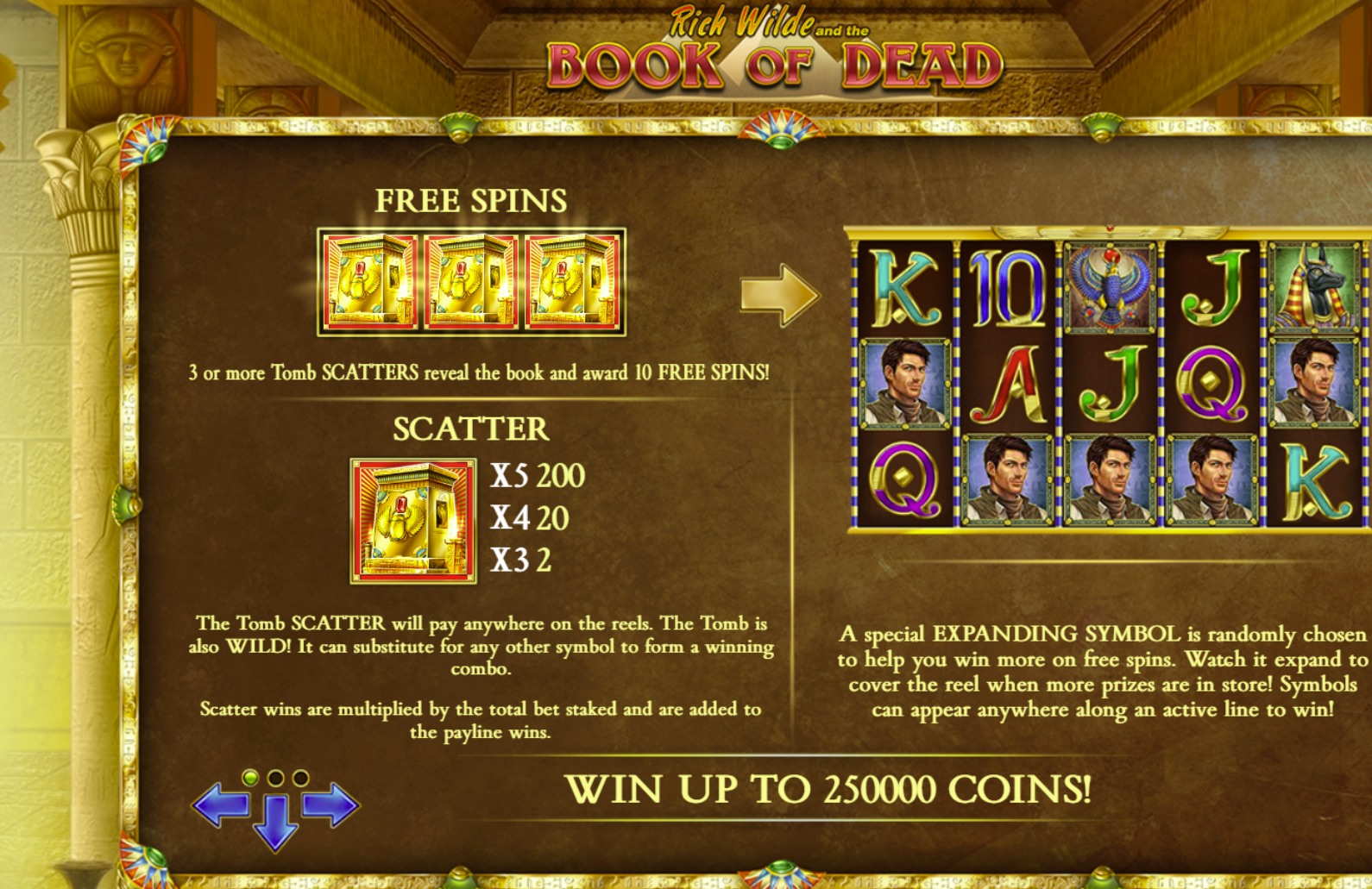 • Landing 3 or more Book symbols triggers 10 Free Spins with a randomly selected expanding symbol.
